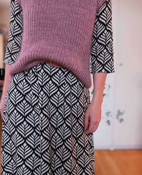 Gestrickt wird der Pullunder aus unseren Qualitäten Amelie und Julie. Beide Materiale werden zusammen verstrickt. Bettina hat ihr Soulbuddy in der Farbe rosenholz gestrickt.